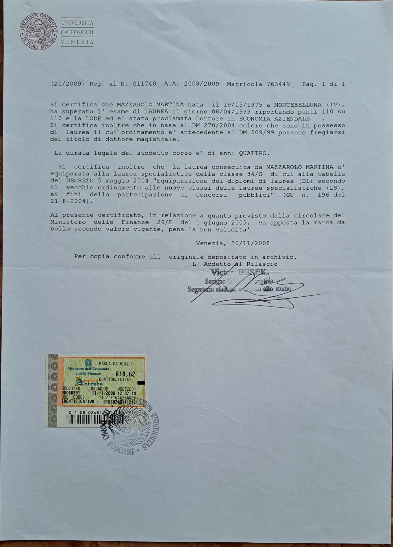 Laudea diploma Mazzarolo Martina